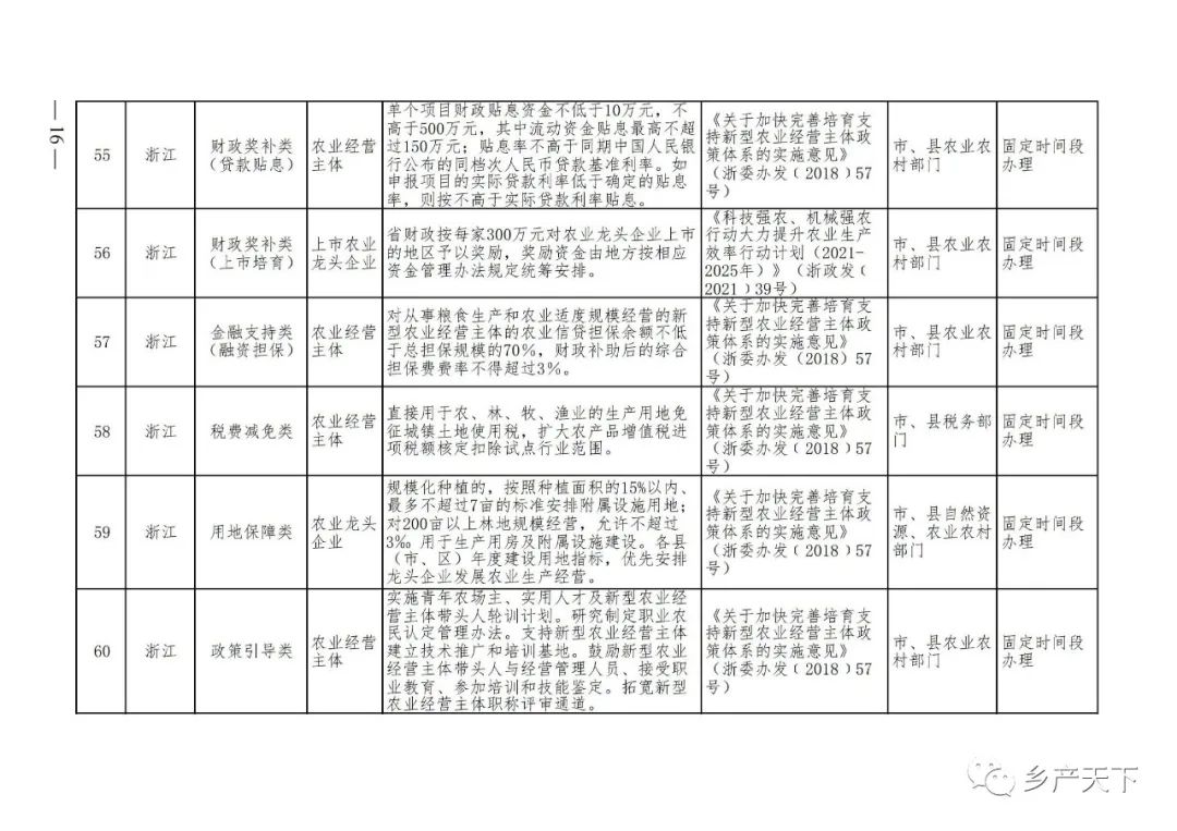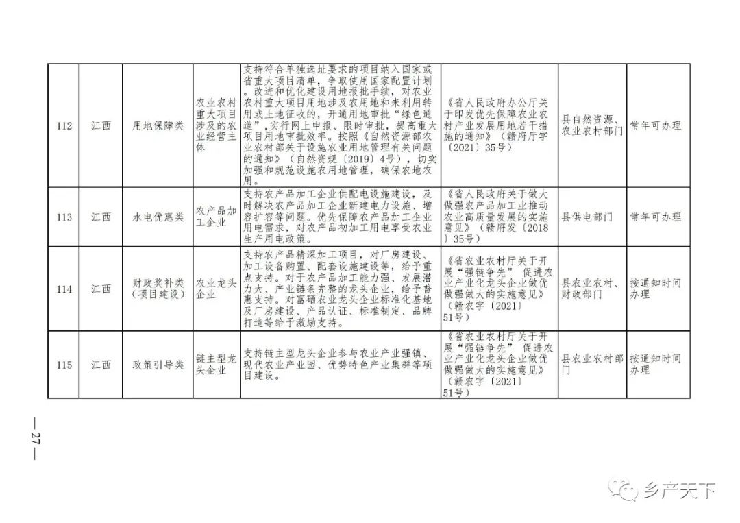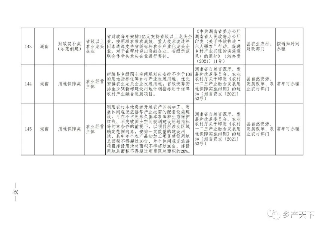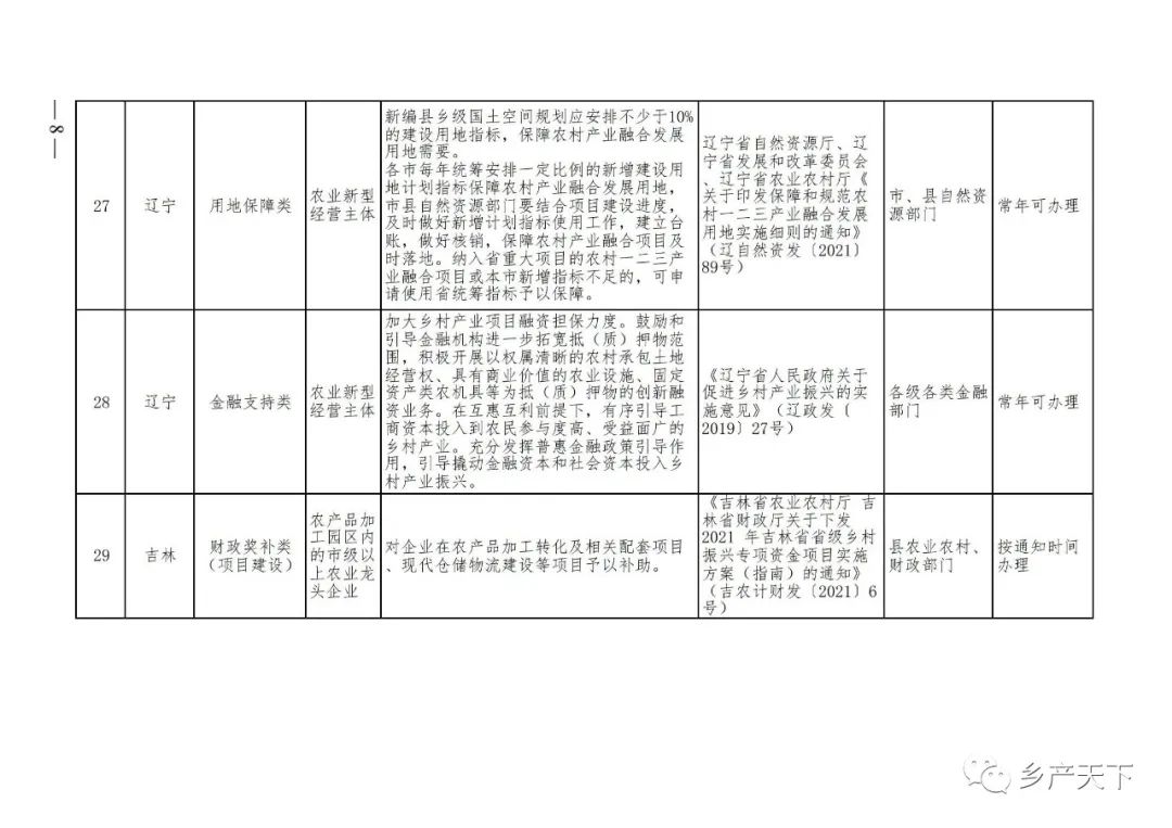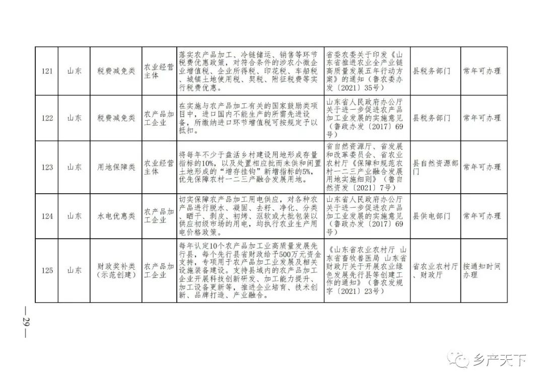《清單》按照“政策類別、支持對象、具體內容、政策依據、辦理部門、辦理時間”進行梳理,共涉及“財政獎補、金融支持、用地保障、稅費減免、水電優惠、政策引導”等六大類229條政策。《清單》通知,各地支持政策發生變化,要及時反饋,鄉村產業發展司將定期更新發布。