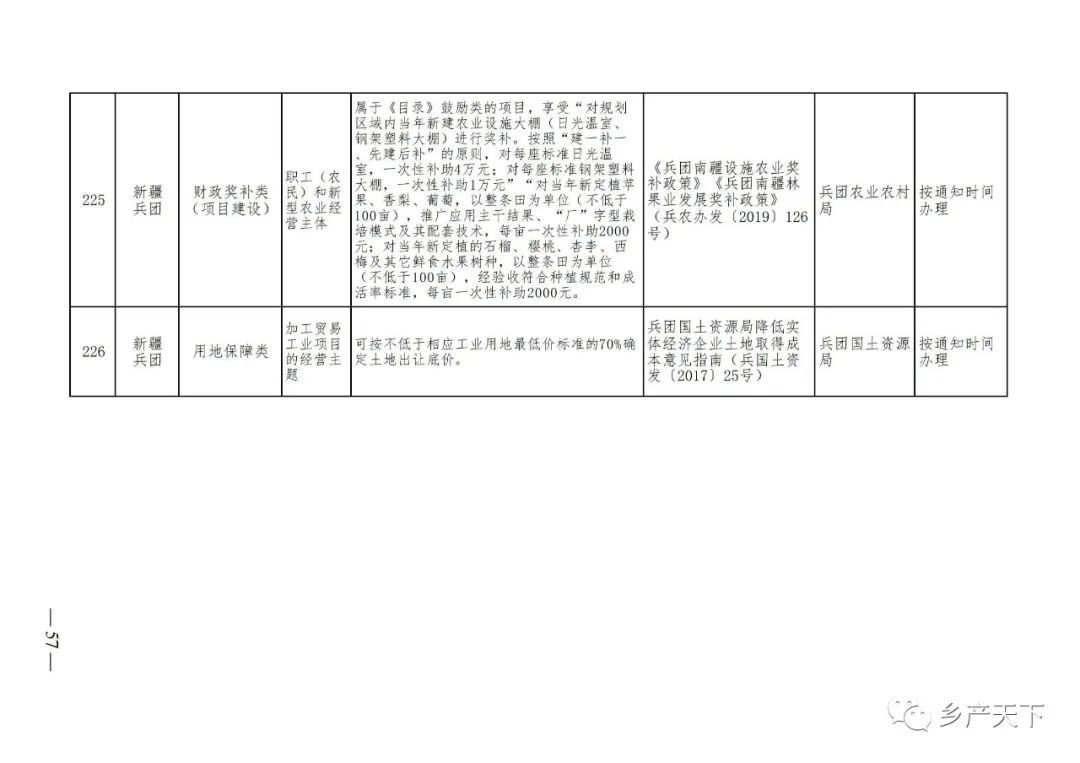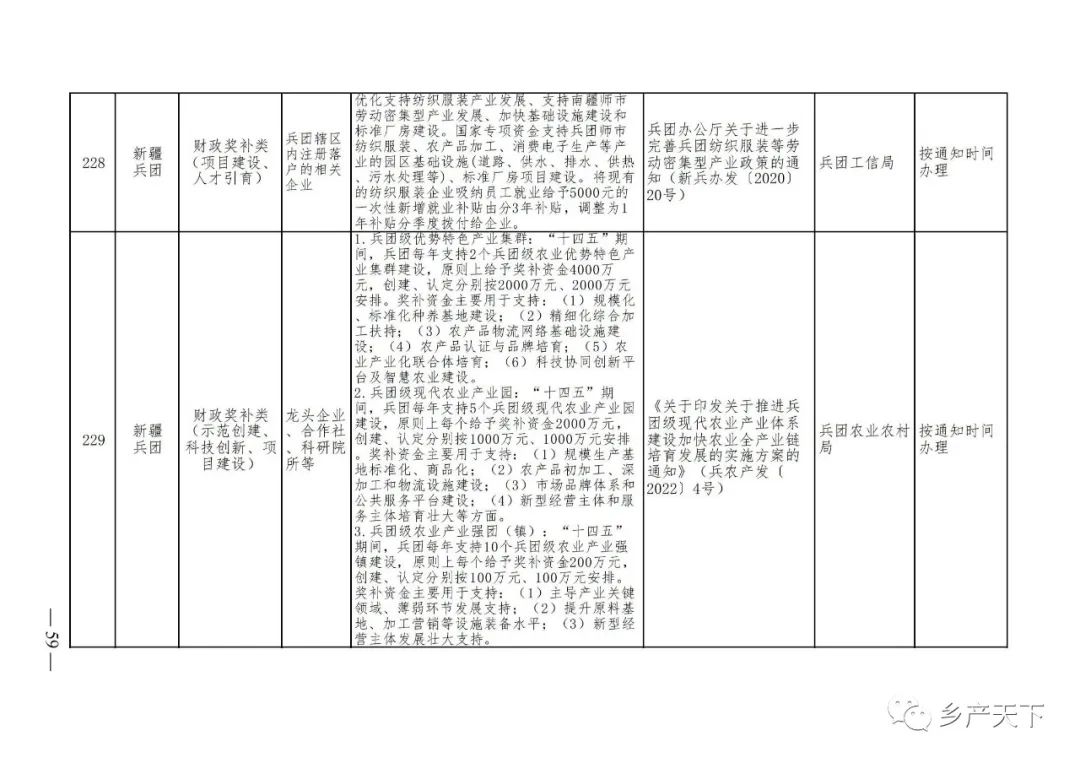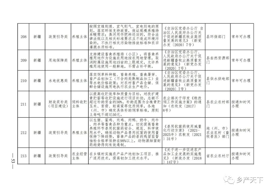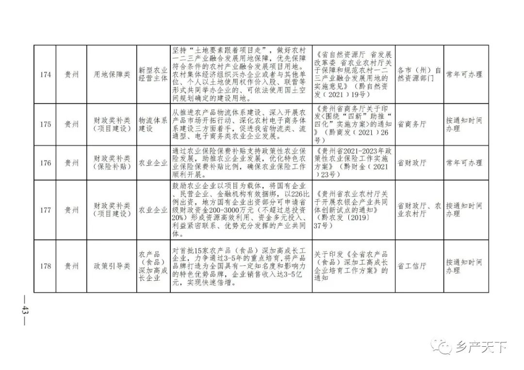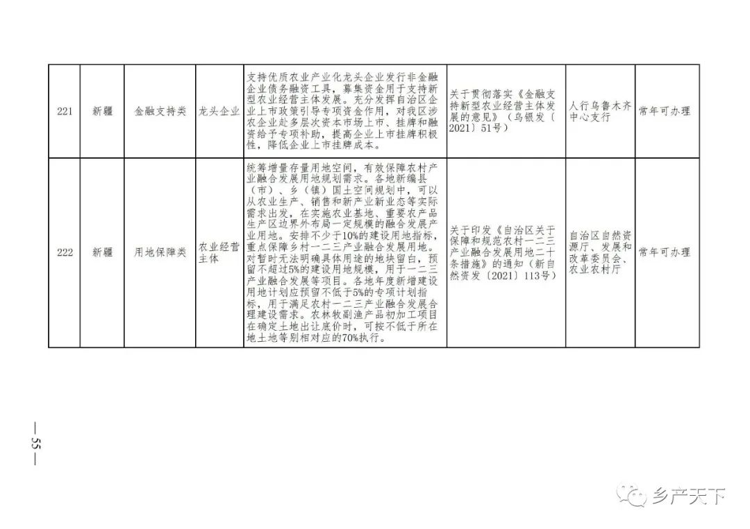 《清單》按照“政策類別、支持對象、具體內容、政策依據、辦理部門、辦理時間”進行梳理,共涉及“財政獎補、金融支持、用地保障、稅費減免、水電優惠、政策引導”等六大類229條政策。《清單》通知,各地支持政策發生變化,要及時反饋,鄉村產業發展司將定期更新發布。
